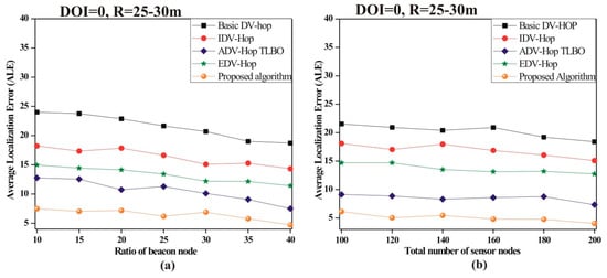 To evaluate the performance, the impact of the ratio of beacon nodes on ALE is observed. For this simulation, a total 100 sensor nodes are deployed with 10% to 40% beacon nodes in a simulation area of 100 × 100 m2. Figure 7a demonstrates the ALE with respect to the ratio of beacon nodes and it is noticed from simulated results that as the ratio of beacon nodes increases, ALE for each algorithm decreases. It happens because the value of the hop-count decreases with increasing density of beacon nodes.