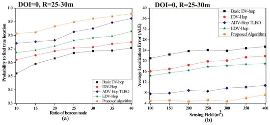 To analyze the impression of beacon node ratio on the probability of true location, a total of 100 sensor nodes are deployed with 10% to 40% beacon nodes. Figure 8a demonstrates that the probability of finding the true location increases as the beacon node ratio increases for all algorithms. The proposed algorithm has more probability of finding the true location as compared to other existing algorithms.