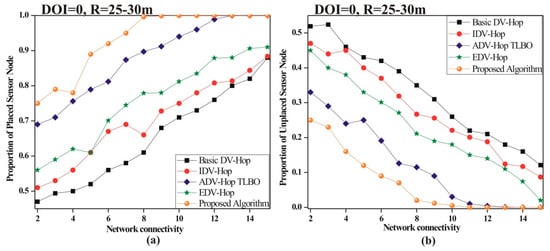 Impact of network connectivity on (a) proportion of unplaced sensor nodes (PUSN) (b) proportion of placed sensor nodes (PPSN).