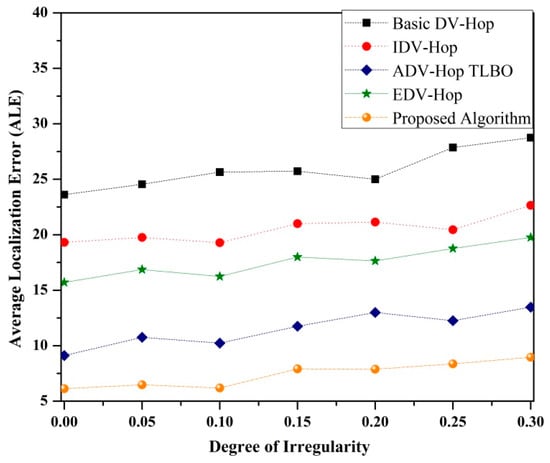 The irregularity in the radiation pattern of sensor nodes is an important parameter that affects the performance of the localization algorithms significantly. To examine the impact of DOI on ALE, the simulation is conducted by deploying 100 sensor nodes with 25% beacon nodes. Figure 10 demonstrates the impact of DOI on ALE for different algorithms. It is observed from Figure 10 that the ALE of each algorithm decreases as the value of DOI increases. This happens because the connectivity of the network decreases with increment of DOI value, therefore the unknown nodes are unable to collect additional information about their neighbor beacon nodes. From the simulated results it can be seen that the proposed algorithm performs better as compared to other existing algorithms.