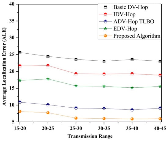 Transmission range of sensor nodes also affects the performance of each localization algorithm. To examine the impact of transmission range on ALE, 100 sensor nodes are deployed in a 100 × 100 m2 area of sensing with 25% beacon nodes and the transmission range is considered as 15–45 m. Figure 11 demonstrates ALE for different localization algorithm with a varying transmission range of sensor nodes. From the simulated results it is observed that as the transmission range of sensor nodes increases, ALE for each algorithm decreases significantly. Figure 11 also reveals that only minor changes take place in localization errors beyond a 25–30 m transmission range. However, the proposed algorithm accomplishes better localization accuracy as compared to the existing one.