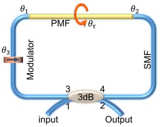 In a Sagnac loop, as shown in Figure 1, the input light is equally split into two propagation beams and re-combined through a 3 dB coupler, which corresponds to the orthogonal polarization modes and propagating along the fast and slow axes of PMF. Therefore, a stable interference will be formed because of the refractive index (RI) difference between and . Furthermore, we define and respectively, as denoting the angles between the light at the spliced point and the fast axis of PMF, and symbolizes the phase shift caused by a modulator.