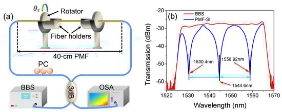 As shown in Figure 2a, the Sagnac loop structure was mainly formed by a 40 cm long PMF (CETC, PM1550-1-06002-3) and a 3 dB SMF-coupler. The input and output ports of the coupler respectively connected with a broadband light source (BBS, homemade, operated in the range of 1525–1565 nm) and an optical spectrum analyzer (OSA, Agilent 86142B, with a resolution of 0.01 nm). The PMF was straightly fixed on the fiber holder and rotator with a small axial stress in order to reduce the fiber bending effect. A polarization controller (PC) was used as a modulator to introduce the matched phase change. Additionally, the distance between two holders was fixed at ~30 mm in order to get a large torsion range. Figure 2b shows the transmission spectra of the BBS (red-line) and PMF-SI (blue-line). The BBS had a flat spectrum with fluctuations of less than 1.9 dB across the whole 40 nm bandwidth, and the three formed fringes were located at 1530.4, 1544.6, and 1558.92 nm. Moreover, the average visibility reached about 25.6 dB with approximately the same FSR (~14.3 nm).