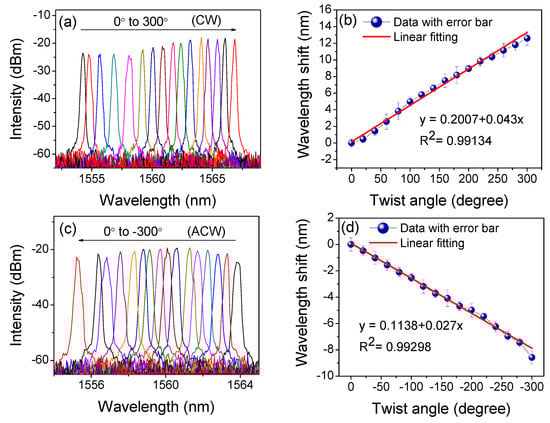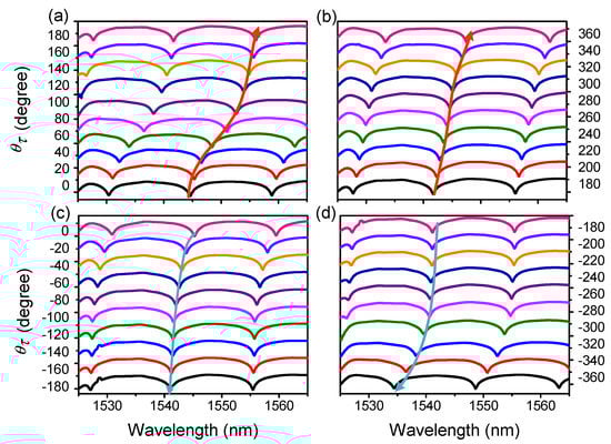 Comprehensive torsion measurements were then performed with the varied in the range from −360° to 360° with an interval of 20°. According to Figure 3a,b, it is clear that the wavelength red-shifted in the CW direction from 0° to 360°, but blue-shifted in the ACW direction from 0° to −360°, as shown in Figure 3c,d. Nevertheless, we also noticed that this wavelength shift was non-linear. Figure 4 shows the torsion response in the CW (from −360° to 360°) and ACW (from 360° to −360°) directions, and the quasi-periodic feature of wavelength shift is exhibited with the added .