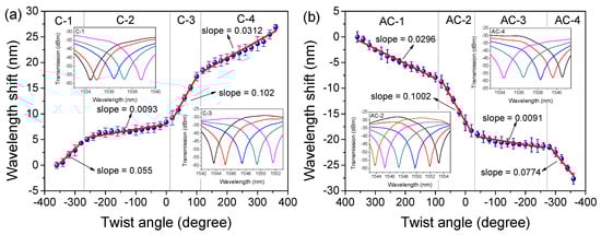 For clarity, the sensitive and insensitive regions in Figure 4a,b were divided into four parts, denoted by C-i and AC-i (i = 1~4), respectively. In more detail, as shown in Figure 4a, the highly sensitive regions were located at C-1(approximately –360° to –260°) and C-3 (0°~120°) with sensitivities of 102 and 55 pm/°. However, the sensitivities were merely ~9.3 and 31.2 pm/° in their neighboring regions C-2 (approximately –260° to 0°) and C4 (120°~360°). These results mean that the PMF-SI is only sensitive to the varied torsion in a small range (100°~120°). Moreover, the maximum sensitivity difference (SD) at around 0° reached 92.7 pm/°, and the minimum value between C-1/C-3 and C-2/C-4 was ~22 pm/°. Similar results were also observed in the ACW direction and are presented in Figure 4b. By calculation, the maximum SD (between AC-2 and AC-3) was found to be 91.1 pm/°, and the minimum SD (between AC-1/AC-3 and AC-2/AC-4) was 21 pm/°. Such high SD values indicate that a pre-twisting angle may be necessary to complete an effective directional torsion measurement.