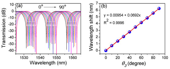 where λ is the wavelength of incident light, L is the length of the PMF, and are the RI of the PMF fast and slow axes, and . For the given angles of , and , Equation (1) can be simplified as