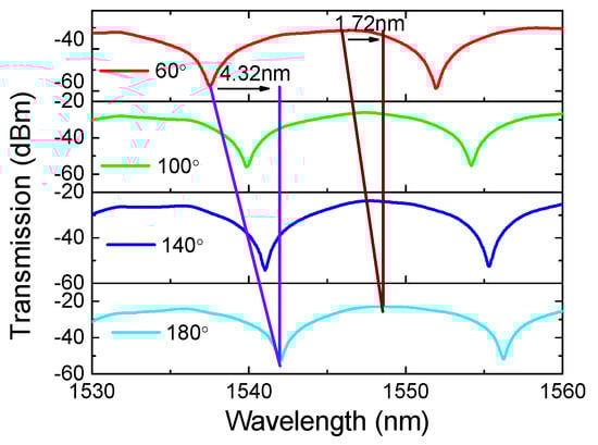 Equation (1) shows that the transmission spectrum of PMF-SI can be adjusted by . A numerical simulation was conducted to reveal the relation between and . As shown in Figure 5a, the interference fringes red-shifted with the varied in the range from 0 to . Additionally, Figure 5b shows that linearly increased with the added and the coefficient was 0.0692 nm/°. In [36], it was shown that can be adjusted and implemented by an external modulator, such as a PC. Additionally, the wavelength-shift difference between the dips and peaks of fringes was investigated. As shown in Figure 6, the dip-shift was about 4.32 nm but the peak merely shifted by 1.72 nm when = 60°~180°. This flat-top feature means that the high SD presented in Figure 4 will be greatly reduced and homogenized when the peaks of fringes are utilized. Additionally, the linear response range will definitely be enlarged although a ~60% reduction in torsion sensitivity will occur.