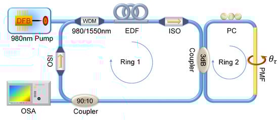 The above analysis indicates that a torsion sensor with an ultra-wide linear response can be achieved by combining a fiber ring laser (FRL) and a well-phase-modulated Sagnac-loop. The experimental setup of fiber laser torsion sensor (FLTS) with a dual-ring-cavity structure is shown in Figure 7, where the Sagnac loop (denoted by Ring-2) as an optical filter as well as the sensing unit is connected with the FRL (denoted by Ring-1) by a 3 dB coupler. In Ring-1, a laser diode (LD, Oclaro LC96HH74P-20R) with a central wavelength of 976 nm is used as the pump source. Through a 980/1550 nm wavelength division multiplexer, a 10 m long erbium-doped fiber (EDF, Nufern EDFC-980-HP) was stimulated by amplified spontaneous emission. Then, the generated broadband light with the band of 1525–1565 nm was equally split into Ring-2.