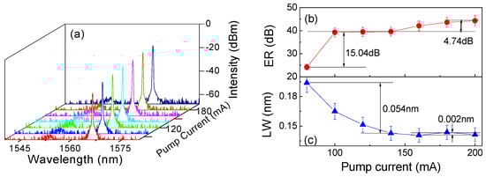 (a) The output spectra, (b) extinction ratio (ER) and (c) line width (LW) of the fiber laser ring (FRL) under a varied pump current (from 80 to 200 mA).