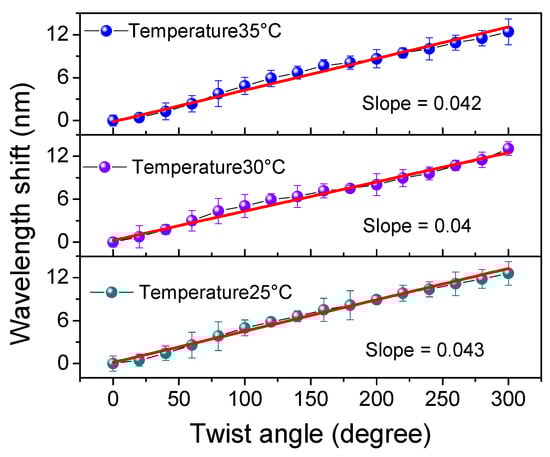 We then set IP = 160 mA and twisted the PMF with the varied . As shown in Figure 9a, the emitted lasing red-shifted by about 12.4 nm in the CW direction with a fluctuation of 6.57 dB. Additionally, the relationship between and is shown in Figure 9b. Compared to the results in Figure 4a, the SD was obviously compressed in the range from 0° to 300° (which corresponds to the range of 0~175 rad/m). Thus, the calculated torsion sensitivity reached 2.46 nm/rad (43 pm/°) with a linearity of 0.991. Similar results in the ACW direction are demonstrated in Figure 9c,d but with a blue-shift in wavelength. By calculation, the torsion sensitivity in ACW direction was determined to be 1.55 nm/rad (27 pm/°) with a linearity of 0.993 in the range from 0° to −300° (which corresponds to the range of approximately 0 to −175 rad/m). Compared to the results shown in Figure 4, the sensitivity in FLTS was reduced by about 57% in the CW direction and 63.5% in the ACW direction, respectively. However, the SD was also reduced by ~82.6% (=) across the whole range of −300° to 300°. We then measured the repeatability of our FLTS at different temperatures, and the corresponding relationships between the wavelength and twist angle are given in Figure 10. According to the measured results, similar torsion sensitivities (~0.04 nm/°) were presented in the range from 0° to 300°. So, the maximum SD at different temperatures was restrained within 0.003 nm/°. This tiny value of SD indicates that our sensor has a stable wavelength response in torsion with a varied ambient temperature.