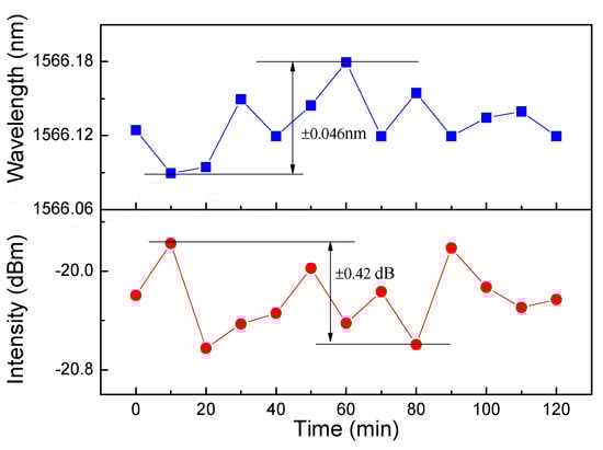 where , and respectively, denote the errors caused by amplitude noise, thermal variation, and spectral resolution. In general, is small enough to be ignored at room temperature and , where is the wavelength resolution of OSA. is the main noise and is dependent on the values of LW and ER. In our sensor, the calculated was equal to 1.25 × 10-2 nm and was 2.89 × 10-3 when the parameters LW = 0.14 nm, ER = 42.18 dB, and = 0.01 nm were adopted. The corresponding resolution was 0.0376 nm and the DL of FLTS reached 0.015 rad/m. In addition, a stability test of the output lasing was performed with respect to the wavelength and intensity when Ip =160 mA and the room temperature was kept at 25 ± 0.2 ℃. Figure 11 shows that within 2 hours, the wavelength and intensity fluctuations of FLTS were constrained within ±0.046 nm and ±0.42 dB, respectively.