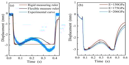 The measuring ruler motion waveform: (a) The simulation curve and the experimental curve; (b) The motion curve with different Young’s modulus.