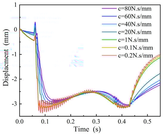 The damping coefficient of the hydraulic damper will affect the motion state of the measuring ruler. A hydraulic damper is a kind of a vibration control device that is commonly used to control impact vibration and it is sensitive to speed response. We performed simulations with different damping coefficients, and the results are shown in Figure 7. The vehicle speed was set to 14 km/h. When the damping coefficient c was 0.1 N·s/mm, the measuring ruler would vibrate violently; and when the c increased to 0.2 N·s/mm or above, the damper had a better control effect on the vibration of the measuring ruler. When the c was set to 20 N·s/mm, the measuring ruler could not return to the initial position after the wheel left, and the rebound displacement of the measuring ruler decreased with the increase of the damping coefficient. When c = 40 N·s/mm or more, the maximum deformation of the measuring ruler was close to the rebound displacement, which easily caused the missing measurement due to the loss of the benchmark of the wheel. In summary, the optimal damping coefficient of the hydraulic damper should be in the range of 0.2–20 N·s/mm.