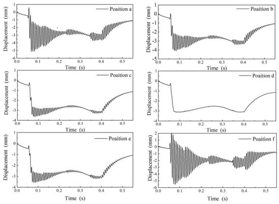 Different measuring positions have a certain influence on the motion state of the measuring ruler. As Figure 8 shows, six measuring positions were selected on the measuring ruler as a to f, and the distances from the left reference point o were 10 cm, 30 cm, 40 cm, 50 cm, 60 cm, and 130 cm, respectively. The vehicle speed was set to 15 km/h during simulation and the motion process of the measuring ruler was simulated under different measuring positions, as shown in Figure 9. As seen in this Figure, the most violent vibration positions were a and f, which were at both ends of the measuring ruler. The best measuring position was d, which was almost not affected by vibration.