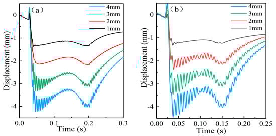 The motion state of the measuring ruler with different downward displacement: (a) The motion curves of the measuring ruler with different displacements at 30 km/h; (b) The motion curves of the measuring ruler with different displacements at 40 km/h.
