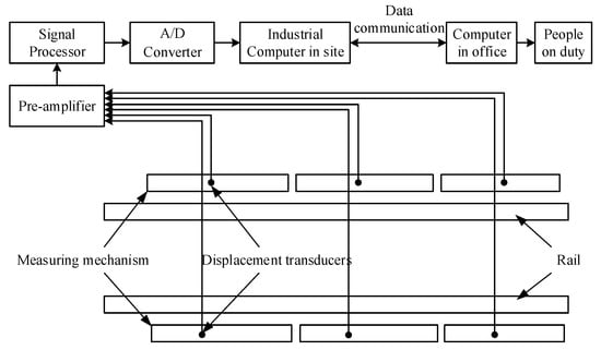 Figure 11 shows that the whole system mainly consists of four parts: the parallelogram mechanisms, the displacement transducer system, the data collection and processing system, and the computer and communication system. To detect tread flats on the entire circumference of the wheel, and avoid two wheels of the same bogie pressing on the same parallelogram mechanism, the following two conditions were met: