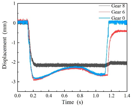 To test system performance, laboratory experiments were carried. The wheel passed through the system at a low speed of 5 km/h. In the measuring mechanism, there are eight gears for the hydraulic damper adjustment, and three gears (gear 0, gear 6, and gear 8) were adjusted in the experiment. The higher the gears, the larger the damping coefficients. Measurements under different gears were conducted and the results are shown in Figure 12. As Figure 12 shows, the variation trend of the curves is consistent with the simulation results in Section 4.2.1. According to the experimental and simulation results, gear 0 of the hydraulic damper was selected due to its good performance.