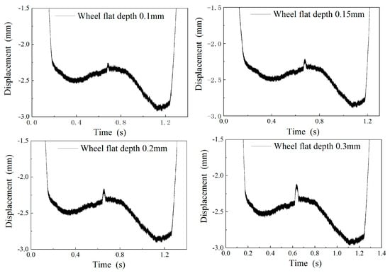 where . While the flat wheel is rolling, the vertical displacement response curve of point O is as shown in Figure 1b. As Figure shows, the maximum vertical displacement of point O represents the wheel flat depth , and the wheel flat length can be calculated according to formula (1).