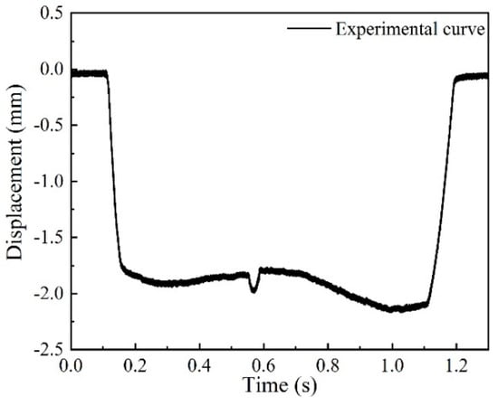 The flexible deformation of the measuring ruler will affect the detection accuracy of the wheel tread flat. Under ideal conditions, the measuring ruler is a rigid body where no deformation occurs under the external force, and the simulation curve of the rigid measuring ruler is shown as the red curve in Figure 5a. In actual measurements, the measuring ruler is deformed flexibly under the wheel pressure, and the deformation is related to the stress conditions. After comparing the simulation curve of the flexible measuring ruler with the experimental curve in Figure 5a, the simulation results were in good agreement with the actual measurement, but the deformation at the rear part in the experimental curve was higher than the front part by 0.8 mm. The reason for this phenomenon may be that the parallelogram mechanism was not completely parallel to the rail during installation, which resulted in different displacements at both ends of the measuring ruler. As Figure 5b shows, the greater the stiffness of the material, the smaller the deformation of the measuring ruler. Therefore, materials with large Young’s modulus E should be chosen.