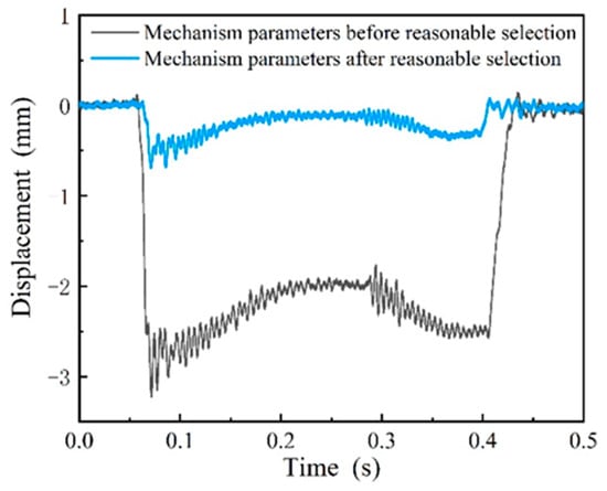 Then the system parameters were selected reasonably based on the simulation results. In the experiments, the eddy current displacement sensor was installed at the optimal measurement position obtained using the simulation in Section 4.2.2, where the limit block was adjusted to allow the downward displacement of the measuring ruler at 0.5 mm. Since the measuring mechanisms were installed at the entrance of the train garage, the maximum speed of the train entering the train garage was 15 km/h, which is limited by the local railway management. The measured waveform with the maximum passing speed of 15 km/h was validated, as shown in Figure 17. In Figure 17, before the selection of the mechanism parameters, the vibration of the measuring ruler was obvious and the maximum amplitude was 0.75 mm, and after reasonable selection, the vibration amplitude was reduced to 0.25 mm. Therefore, after reasonable selection of the parameters, the vibration could be reduced and the speed threshold of the measuring ruler could be improved.