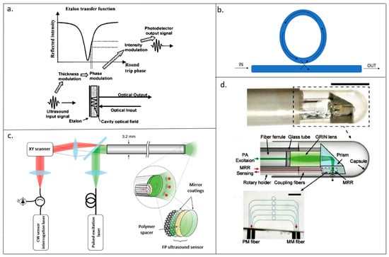 FPI is a type of interferometer that is made up of a thin transparent film sandwiched between two reflectors [65]. The pressure changes created by the incoming ultrasonic wave causes variation in the thickness and elasto-optic of the structure, which in turn, causes an optical phase shift [65]. An interferometer then transforms this optical phase shift into measurable intensity modulation [66]. The working principle of FPI is illustrated in Figure 1a.