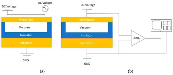 (a) Capacitive micromachined ultrasound transducers (CMUT) transmission mode; (b) CMUT receiving mode.