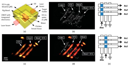 - Chen, J.; Wang, M.; Cheng, J.; Wang, Y.; Li, P.; Member, S. A Photoacoustic Imager with Light Illumination Through an Infrared-Transparent Silicon CMUT Array. IEEE Trans. Ultrason. Ferroelectr. Freq. Control 2012, 59, 766–775. [Google Scholar] [CrossRef] [PubMed]