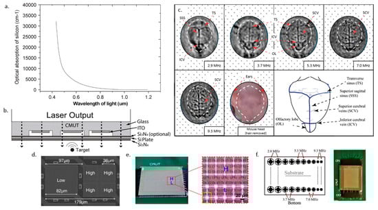 (a) Optical absorption of silicon under different wavelength (© [2010] IEEE. Reprinted, with permission, from [118]) and (b) structure of optically transparent CMUT (© [2018] IEEE. Reprinted, with permission, from [126]), (c) imaging of mouse brain using the different frequencies of the CMUT (© [2018] IEEE. Reprinted, with permission, from [130]), (d) interlaced CMUT (© [2017] IEEE. Reprinted, with permission, from [128]), (e) multi-band CMUT (Adapted with permission from ref [129], [The Optical Society]), (f) monolithic multiband CMUT with five frequencies (© [2018] IEEE. Reprinted, with permission, from [130]).