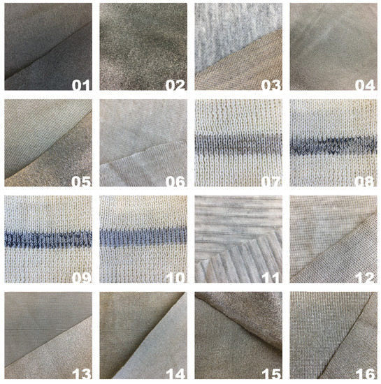 Silver is a popular material for conductive textiles as it has a low electrical resistance and is safe to be worn against the skin. It is most commonly plated around a nonconductive fiber which is then plied and woven or knit into a textile. There are many kinds of silver-plated materials in the market and Samples 02 to 08 and Samples 11 to 16 are silver-plated sensors with different material compositions and knit structures. Sample 02 uses MedTex 180, Sample 05 uses MedTex P-180, and Sample 15 uses Technik-tex P130B, all from Statex Produktions. Samples 11 to 14 and Sample 16 are from Chinese shielding fabrics manufacturer (DaZhi, QingDao, China). Sample 11 uses silver fiber antibacterial conductive cloth (DaZhi #3-17), Sample 12 uses metal fiber radiation protection fabric (DaZhi #3-2), Sample 13 uses 135 g 100% silver fiber four-way stretch fabric (DaZhi #3-18), Sample 14 uses 130 g 100% silver fiber four-ways stretch fabric (DaZhi #3-15), Sample 16 uses 100% silver fiber ion cloth (DaZhi #3-8-1). Samples 03, 04, and 06 are from Less EMF Inc. (Ithaca, NY, USA), with corresponding product numbers Cat.#1281, #A321, and #1224. In addition, Shieldex 110/34 dtex, 2-ply yarn from Statex Produktions is knit in Samples 07 and 08.