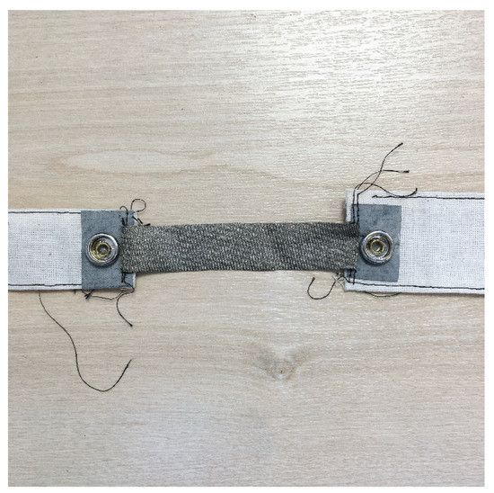 Sixteen stretch sensors were constructed using the above materials. All the conductive fabrics were cut and the conductive yarns knit to the same dimensions of 20 mm × 100 mm when under no strain. As Figure 2 shows, each piece of conductive fabric is stitched to a piece of woven fabric. The woven fabric is attached to the tensile testing machinery during the stretching tests. Each end of the conductive sensor fabric is electrically connected to a press-fit snap via conductive ripstop fabric. The snaps provide a wired connection to a breadboard containing a microcontroller resistance measuring circuit.