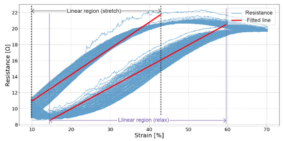 In this study, we look at the linear relationship between resistance and strain during stretching and relaxation in the dynamic test, where one hundred cycles of stretching and relaxation data are aggregated and the start and end of linear regions identified. In an ideal sensor, the resistance change should have a linear relationship to the extension so that the extension can be inferred from the resistance measurement.