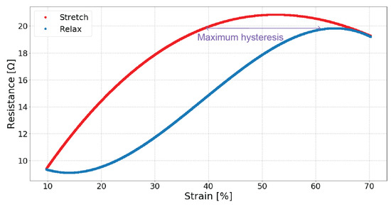 The dynamic test looks at the relationship between resistance and strain over repeated measures. The electrical resistance performs differently when the sensor is stretched compared to when it is relaxed, and the maximum difference between stretch and relax is the hysteresis. Figure 4 illustrates an example of the measured hysteresis. It is calculated by fitting a third order curve to the stretch and relaxation data, then calculating the maximum difference of the two curves.
