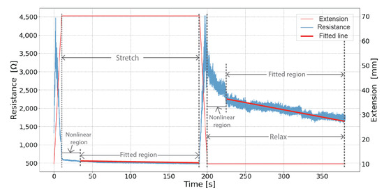 Table 8 shows each sensor’s information when they are held at a constant strain of 70%, the elapsed time of the nonlinear region, the average resistance value when the sensor is stretched, the RMSE of the fitted line, and the slope of the fitted line. The nonlinear time is how long the nonlinear region lasts at the beginning after the sensor is stretched and first held at 70% strain. As the sensors have different scales of resistance, their averaged resistance is calculated and used to normalize the RMSE for each sensor.