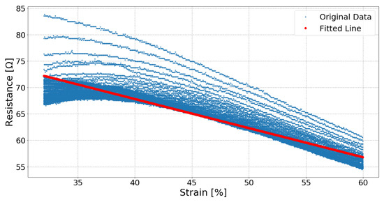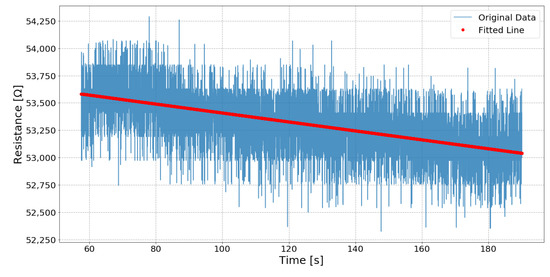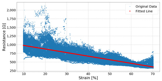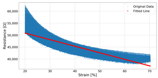 Figure 13 shows an example of the line fitting, which is the average result of sensors held at a constant strain of 70%, and Table 9 shows each sensor’ analysis when held at a constant strain of 10%. Samples 16 and 03 are too noisy to fit a meaningful line.