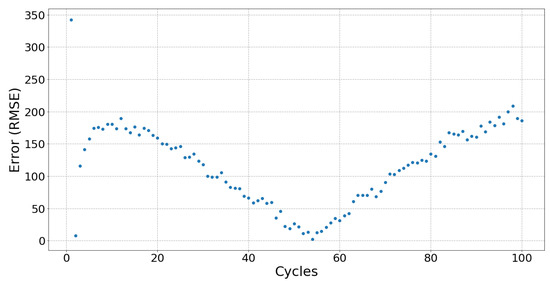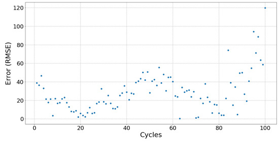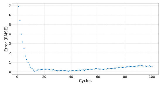 During one hundred cycles of stretching and relaxation, 9 of the sensors show resistance change and 10 of the sensors show signs of fatigue. With the increasing cycles, resistance of Sample 1 decreases and resistance of Samples 2, 3, 6, 7, 8, 11, 12, and 16 increases. Table 6 shows the number of cycles when sensors were fatigued as indicated by a change from decreasing to increasing error (RMSE).