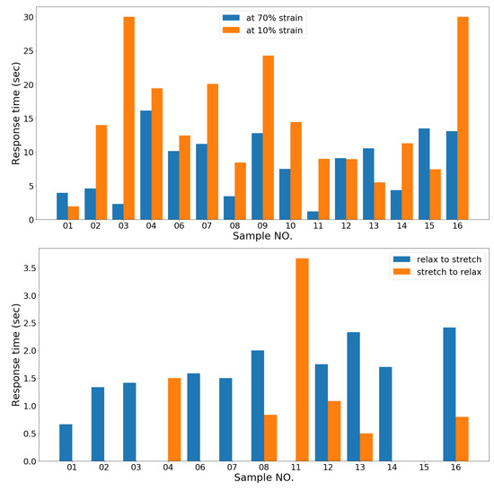 Responsiveness is defined as how fast the sensor responds electrically to a change in physical direction. We measure the response time when changing from stretching to relaxing and vice versa. We determine the nonlinear region by visual observation, then measure the length of time of the nonlinear region in dynamic and static tests. In the dynamic test, we measured the average nonlinear region of one hundred cycles in two directions, from relax to stretch and from stretch to relax. In the static test, we measure the nonlinear region when samples are initially held at 70% strain (stretched) and 10 strain% (relaxed), as shown in Figure 5.