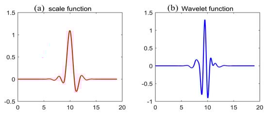 where f is the original observed signal; and are decomposed low-frequency and high-frequency coefficients, respectively; and and are the scale function and wavelet function, respectively. Symlets wavelet function is selected for our study, which can reduce the phase distortion in signal analysis and reconstruction and is suitable for the original signal processing of a north-seeking gyroscope in continuity, support length and filter length []. The number of vanishing moments for the Symlets wavelet function in our study is 10 (Sym10). The images of and are shown in Figure 1.