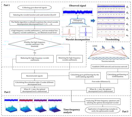 The wavelet transform (WT) proposed by Morlet is a signal analysis and filtering method with high resolution in both the time and frequency domains [], which has applicability in processing non-linear and non-stationary data. The basic idea is to use a window function to construct a basis function for orthogonal transformation []. The signal is decomposed into a series of wavelet coefficients, including high-frequency and low-frequency coefficients, by choosing an appropriate wavelet function. The high-frequency coefficients are limited according to the corresponding threshold criteria, and then reconstructed with low-frequency coefficients to achieve the purpose of de-noising and correction [,]. With the development of the WT filter, the application field has been greatly expanded to include biomedicine [,,], geophysics [,], image processing [,], tracking detection [,,], and feature extraction [,,]. The wavelet filter also has precedents for signal processing of gyroscope sensors of the strapdown inertial navigation system (SINS) used for attitude determination, such as the fiber optic gyroscope (FOG) [,] and micro electro mechanical system (MEMS) gyroscopes [,], for which good application results have been achieved in previous studies [,,,]. However, the widely-used suspension tape gyroscope sensor is limited by the tracking north-seeking mode of collecting scattered points, which cannot easily simulate the changeable environment in real-time. Since there are fewer redundant observations of this north-seeking mode, the application effect of the filtering model is not significant [].