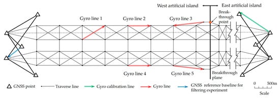 An innovative new type of north-seeking gyroscope, the magnetic levitation gyroscope (GAT), developed by the Chang’an University and China Space Age Electronics 16th Research Institute in 2008, adopts a magnetic suspension-supporting and non-contact photoelectric technology to measure the true geographical azimuth (the nominal orientation accuracy is 3.5″ in 8 min) []. The GAT has the capacity to dynamically record large amounts of north-seeking parameters in real-time, which allows monitoring of a changing environment (40,000 groups of observed signals per orientation result). It is possible to optimize the non-stationary gyro data with modern filtering technology and extract the effective components from the noisy signals, thus improving the north-seeking orientation accuracy []. Since 2008, the GAT has been widely used in several major underground engineering projects in China and provided reliable orientation checks for the breakthrough of the tunnels, such as in the cases of the Qinghai–Tibet Railway Tunnel [], the Hanjiang River Diversion to Weihe River Qinling Water Conveyance Tunnel [], and the Immersed Tunnel of the Hong Kong-Zhuhai-Macao Bridge [].