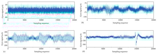During orientation measurement in a tunnel, gyro data are not only affected by the constant and random drift errors of the sensor but also the external environmental factors, such as blasting, construction vibration, air draft-induced vibration of passing vehicles [,], magnetic field interference, and changes in temperature, humidity and air pressure [,]. These interference factors (especially physical vibration) cause abnormalities of the gyro signal, which contains significant non-stationary noise, leading to distortion of the orientation results [].