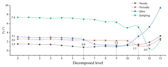 For steady and periodic signals, which are less affected by the external environment, H and DF improved slowly with the increase of decomposed level, and a moderate decomposed level (6 to 8) can meet the requirements of the correction of the north-seeking result (Table 3). For jitter and jumping signals that are heavily disturbed by environmental factors, a higher decomposed level (8 to 10) should be carried out to further correct the abnormal trend caused by low-frequency disturbances (Table 3). However, this does not mean that the higher the decomposed level, the better the north-seeking result that will be achieved. Excessive filtering may cause negative effects and worsen the north-seeking result. Consequently, the wavelet decomposition should not exceed level 10 for the GAT data filtering. Thus, although periodic and jumping signals show better H and DF results at a higher decomposed level = 12, we still choose an optimal decomposed level = 8 or 10 (Table 3), which is safer and meets the de-noising requirements.