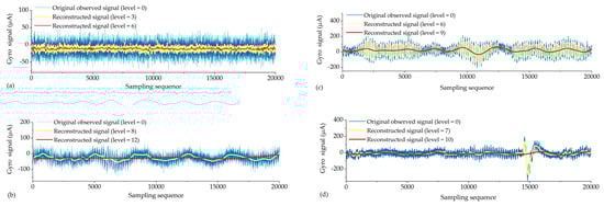 - Periodic signals were collected under the conditions where interference can be ignored. Like the pattern of steady signals, high-frequency noise accounts for most of the spectra, while the periodic low-frequency coefficient occupies most of the amplitude energy (Figure 8d). When the decomposed level = 8, most of the Gaussian noise was eliminated, but the time series of signals still retained periodic characteristics (yellow line in Figure 7b) since the low-frequency wavelet coefficients had a large residual in the spectra (Figure 8e). To remove the periodicity and make the signal smoother (red line in Figure 7b), the decomposed level needed to reach 12 (Figure 5 and Figure 6). Consequently, only very small wavelet coefficients (smaller than 2 × 10−7) were left in the spectrum (wavelet in Figure 8f) and DF changed from 2.6″ to 1.3″ (Figure 6). This periodic trend is the weak response to the environmental factors of the torque rectification algorithm of GAT, which belongs to regular systematic error []. It affects the signal dispersion (RMSE) but has less influence on the north-seeking result (mean value). Therefore, it is not necessary to completely eliminate the periodic trend in the signal.