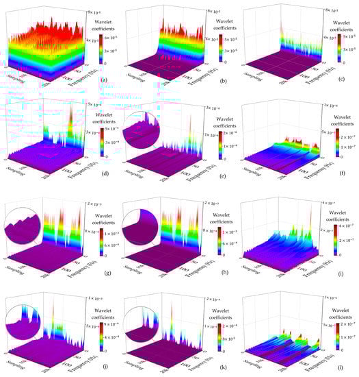 3D time-frequency spectra of four types of signals under different decomposed levels: (a) steady (level = 0); (b) steady (level = 3); (c) steady (level = 6); (d) periodic (level = 0); (e) periodic (level = 8); (f) periodic (level = 12); (g) jitter (level = 0); (h) jitter (level = 6); (i) jitter (level = 9); (j) jumping (level = 0); (k) jumping (level = 7); (l) jumping (level = 10).