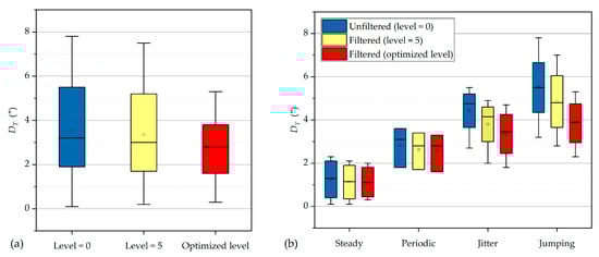 In Figure 9a, compared with the unfiltered signal, DT showed a significant difference compared to filtering with the optimal decomposed level (p < 0.01, n = 15). Compared to the filter with decomposed level = 5, DT also showed a significant difference to the filter with the optimal decomposed level (p < 0.01, n = 15), which suggested that the accuracy of the north-seeking results was improved compared to the empirical decomposed level in previous studies [,,]. This shows the benefit of the optimization of the wavelet decomposed level according to different types of observed signals, so that the de-noising and corrective effect of north-seeking results can be improved as much as possible. In Figure 9b, the more obvious the change in DT is, the more significant the de-noising effect of the wavelet filter. The result showed that the de-noising effect on jitter and jumping signals is better than on steady and periodic signals, which is consistent with the result of the above experiments in Section 3.1. A significance test was made on DT with the three kinds of filtering scheme mentioned in Section 2.3.3: (1) unfiltered (decomposed level = 0); (2) filtering with decomposed level = 5; and (3) filtering with the optimal decomposed level.
