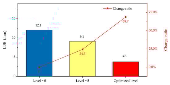 To verify the feasibility of this method, three kinds of filtering schemes were adopted to process the observed gyro signals on the 5 gyro (traverse) lines in the network (red arrows in Figure 3): (i) unfiltered, the wavelet decomposed level = 0; (ii) filtering with all wavelet decomposed levels = 5, which is the empirical value in previous studies [,,]; (iii) filtering with the optimal decomposed level determined by the above experiments. Two types of indicators were used to compare the different filtering schemes in our study: (1) define the absolute differences between the filtered gyro grid bearings and the classical survey bearings as DT, which represents the external coincidence accuracy of gyro bearings; (2) the lateral breakthrough error (LBE) at the breakthrough point (Figure 3), which represents the lateral coordinate difference value of the point between the western and eastern island networks with gyro observations []. The smaller the above indicators are, the better the obtained de-noising effect of the signal processing scheme will be.