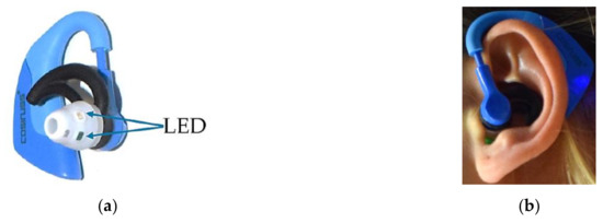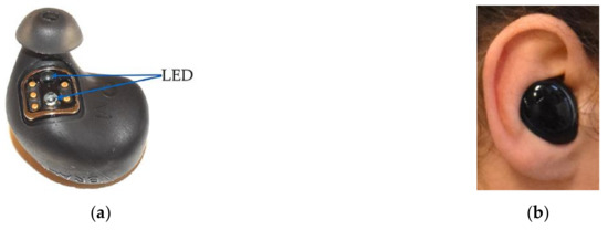 As a result of the development of mobile heart rate monitors, heart rate has become one of the most widely used methods for controlling the general state of health and, particularly, the intensity of physical activity [1]. In 1938, Hertzman [2] first introduced photoplethysmography (PPG) as an alternative to electrocardiographic (ECG) heart rate monitoring. Since then, PPG has gained increasing popularity [3] and, with increasing technological improvements, it is used as an alternative pulse rate measurement method in wearable devices. In his review article, Toshiyo Tamura [4] provides an overview of the parameters that influence PPG signals. Besides the wavelength of light, contact force, motion artefacts, ambient temperature, and light intensity, the anatomical measurement location also influences PPG signals. Currently, PPG signals can be measured at the wrist [5,6,7], upper and lower arm [8,9,10], finger [11], esophageal region [12], forehead [13,14], and the ear, respectively. Ear-worn devices are defined as devices worn in or on the ear. Specifically, pulse rate measurement at the earlobe [15], the external ear cartilage [16,17], the superior and inferior auricular region [18,19,20,21], and the external auditory canal [22,23,24] has already been discussed in several studies as an alternative to ECG heart rate monitoring. Besides wrist-worn devices, ear-worn devices are probably the most common application of PPG.