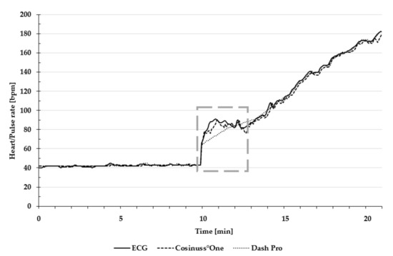 Exemplary presentation of pulse and heart rate during the entire test protocol. The dashed frame indicates the change from lying position to cycling. Heart rate of the ECG is depicted as a solid line; the pulse rate of Cosinuss°One is depicted as the dashed line; and the pulse rate of Dash Pro is depicted as the dotted line.