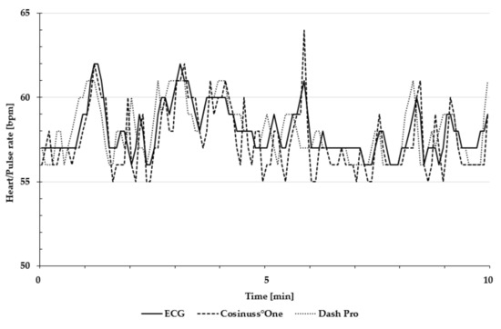 Exemplary presentation of pulse and heart rate during the 10 min rest measurement in a lying position. The heart rate of ECG is depicted as the solid line; the pulse rate of Cosinuss°One is depicted as the dashed line; and the pulse rate of Dash Pro is depicted as the dotted line.