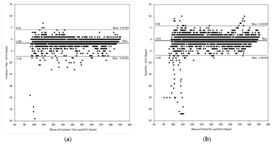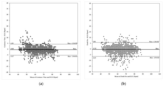 Figure 5 shows Bland–Altman plots of the Cosinuss°One and the Dash Pro in-ear devices in comparison to the ECG with Bodyguard 2.