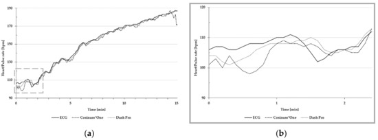 Exemplary presentation of pulse and heart rate (a) during the entire stress protocol; (b) around 100 bpm. The heart rate of ECG is depicted as the solid line; the pulse rate of Cosinuss°One is depicted as the dashed line; and the pulse rate of Dash Pro is depicted as the dotted line.